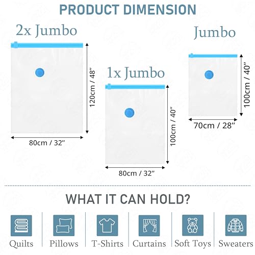 VACUUM BAGS for STORAGE: 4 multiple size space-saving vacuum storage bags with pump take every bit of air from the bags, shrink blankets and quilts to 80% and clothes and other goods to 60% saving space for more storage. As every season requires swapping clothes out of the wardrobe, vacuuming helps create 3X storage space in the wardrobe for various seasons