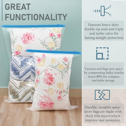 VACUUM BAGS for STORAGE: 12 space-saving vacuum storage bags with electric & hand pump take every bit of air from the bags, shrink blankets and quilts to 80% and clothes and other goods to 60% saving space for more storage. As every season requires swapping clothes out of the wardrobe, vacuuming helps create 3X storage space in the wardrobe for various seasons