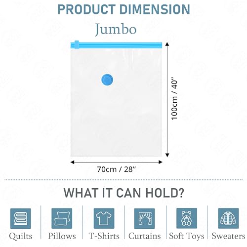 DIMENSION & CAPACITY: 6-Jumbo: 70 x 100 cm (28 x 40 inches) bags that accommodate 2 pillows and 1 king-sized duvet. A hand pump is included in the combo, which can be used during your trips